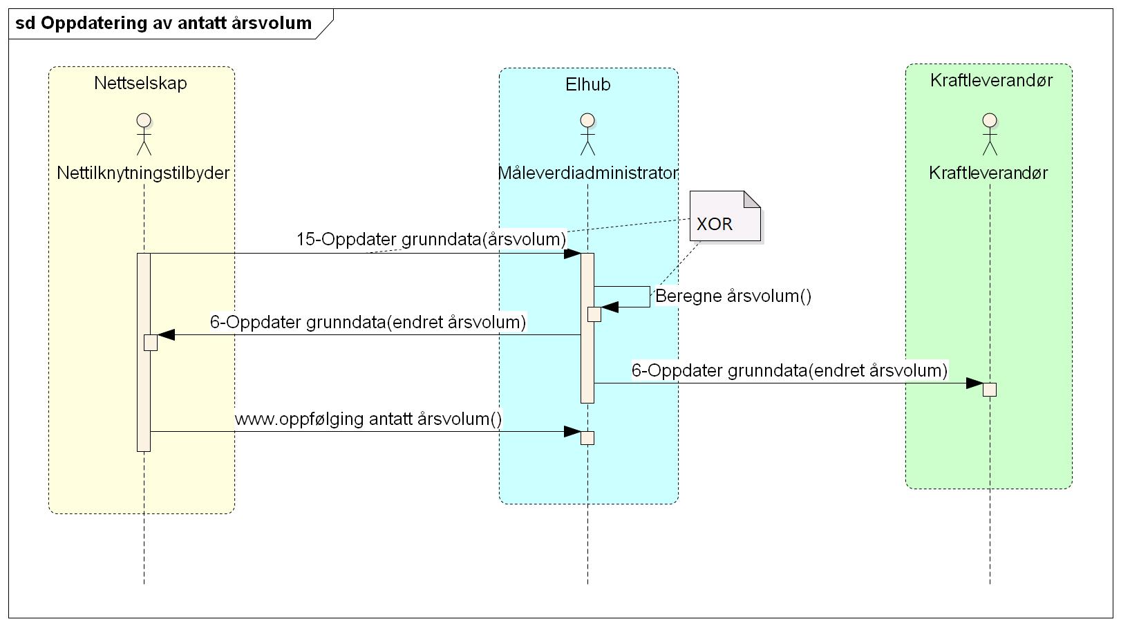 Elhub beregner antatt årsvolum og sender melding med oppdatert antatt årsvolum til nettselskap, kraftleverandør og tredjepart. Elhub forventer ingenting i retur fra nettselskapet